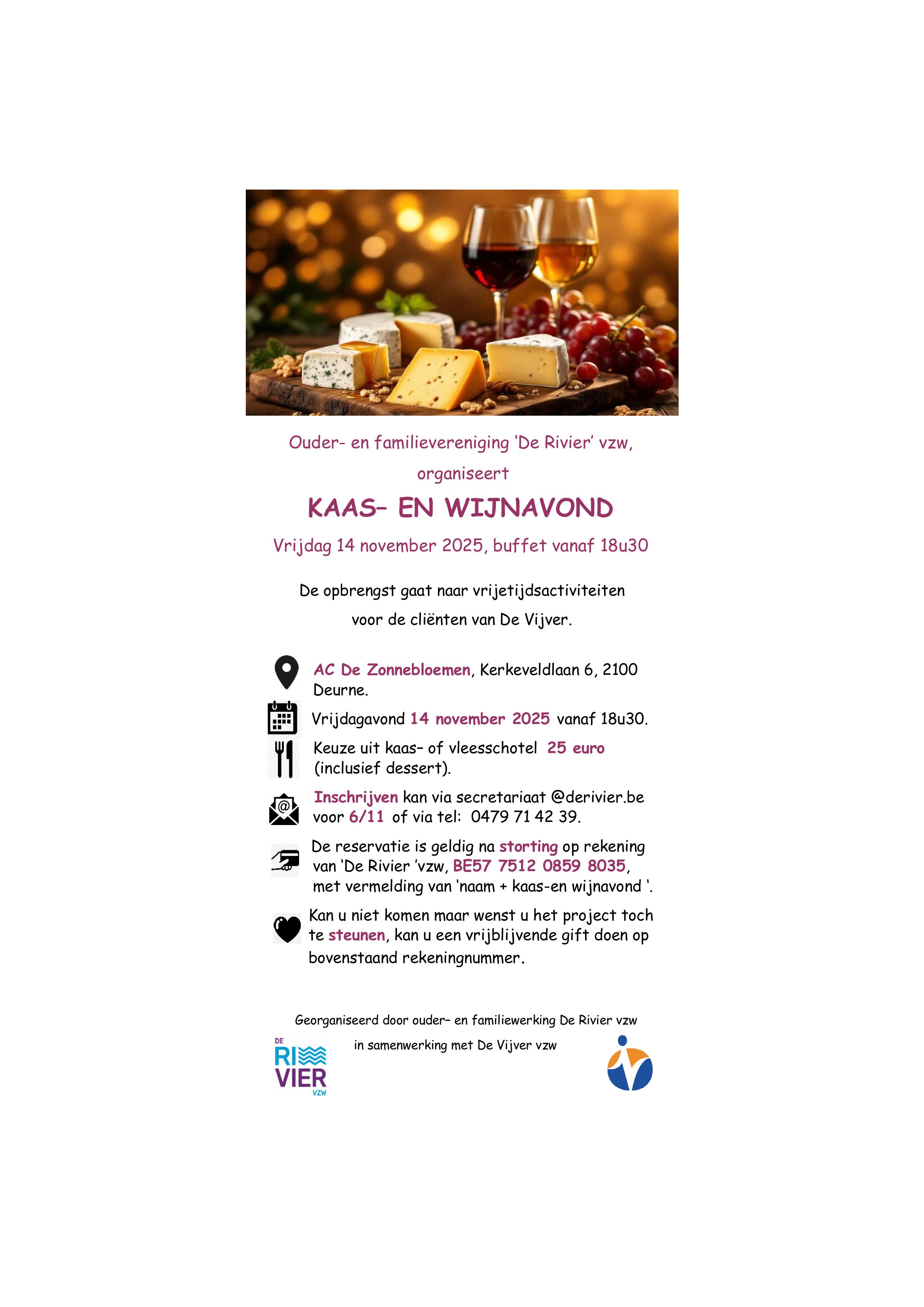Ouder- en familievereniging De Rivier vzw nodigt je van harte uit op haar gezellige kaas- en wijnavond op vrijdag 14 november 2025.